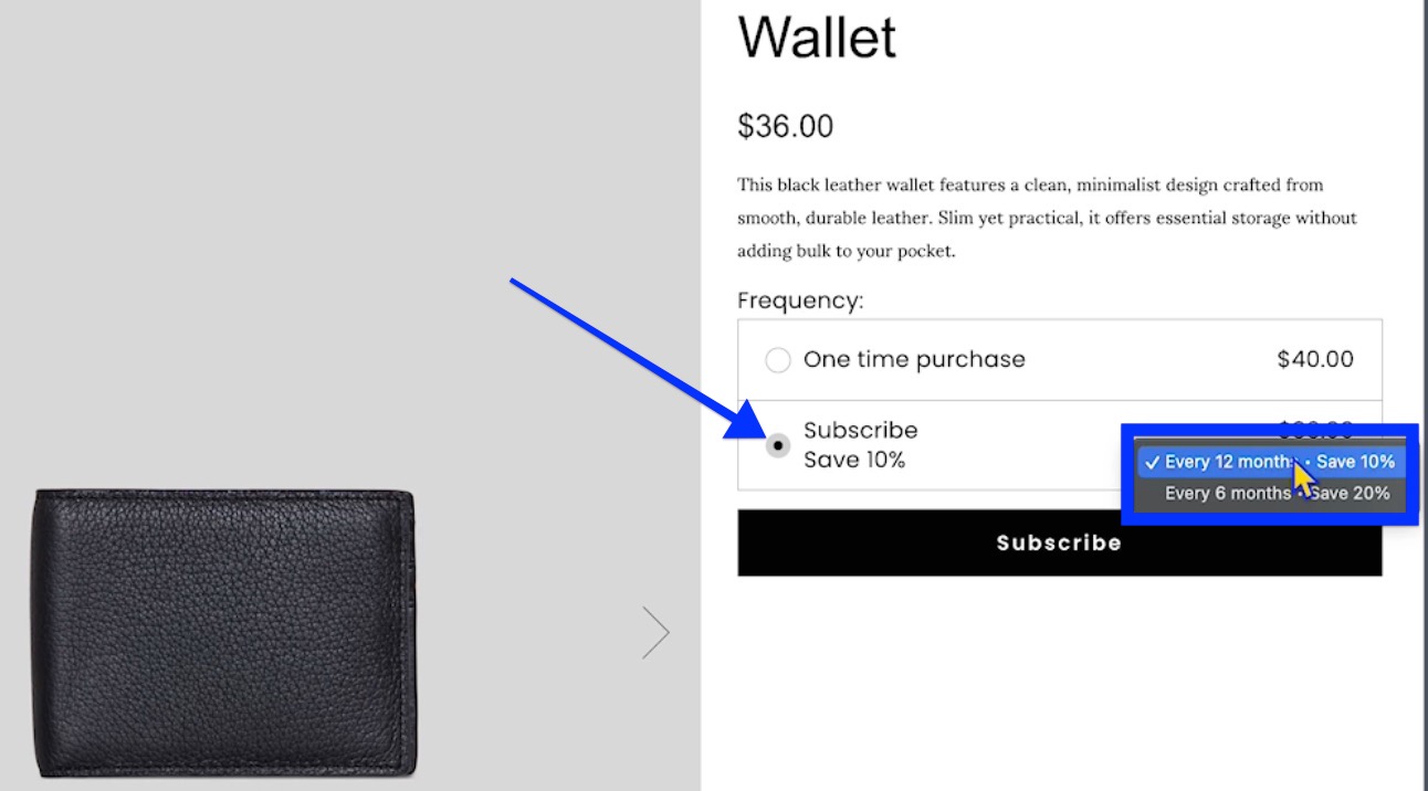 하나의 제품을 일회성 구매와 구독으로 모두 제공하는 경우, 고객은 제품 상세 정보 페이지에서 두 옵션 중 하나를 선택할 수 있습니다. 고객이 구독을 선택하면, 두 개 이상의 갱신 빈도를 제공하는 경우 드롭다운 메뉴에서 빈도를 선택할 수 있습니다. 갱신 빈도 할인 설정이 있는 경우, 해당 할인도 드롭다운 메뉴에 표시됩니다. 구독 전용 제품의 경우에만 구독 옵션이 표시됩니다.